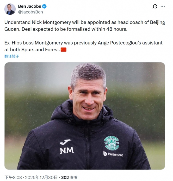 零点吧足球12月30日讯 据记者雅各布斯(Ben Jacobs)报道,尼克·蒙哥马利将出任北京国安主帅,预计正式协议在48小时内签署。