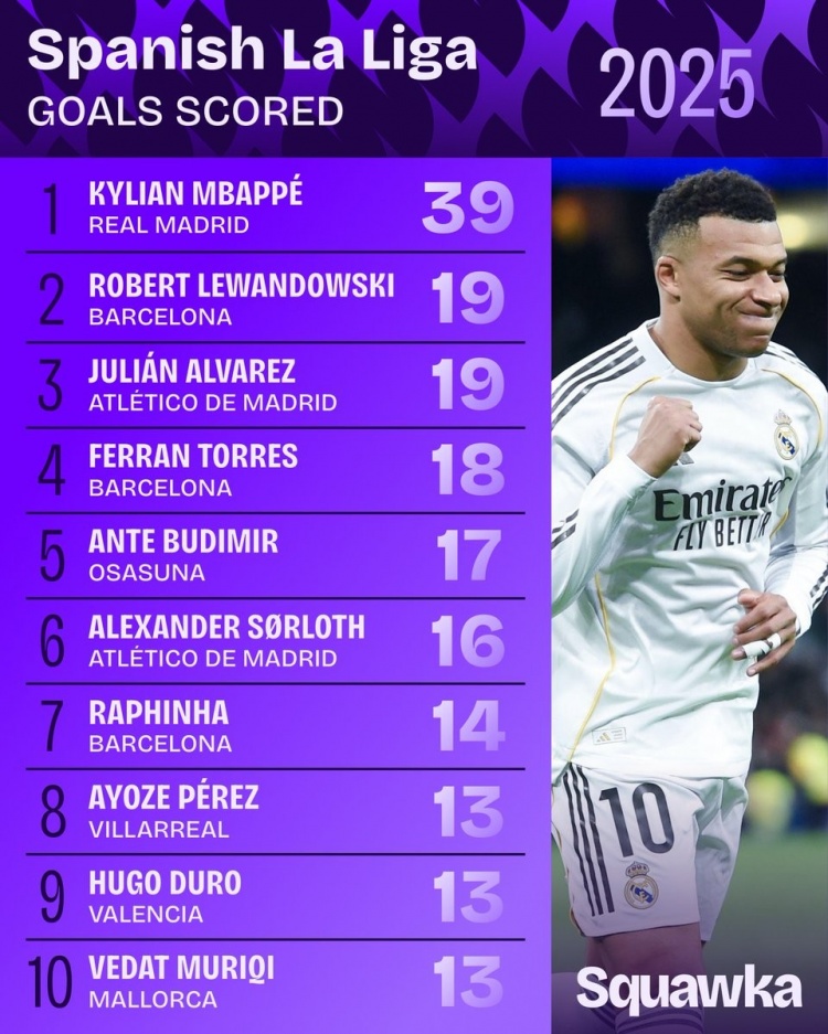 零点吧足球12月30日讯 2025年接近尾声,squawka也统计了本年度西甲进球情况,姆巴佩独自断崖领跑。