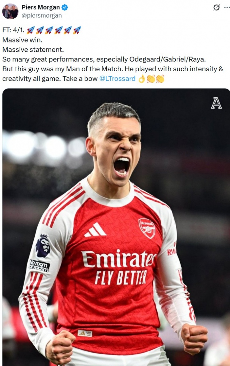 阿森纳拥趸摩根赛后也在社媒评论道:“终场比分4-1!关键的胜利,重要的宣言。本场比赛多人的出色表现中,厄德高、加布里埃尔和拉亚尤为突出。但我的全场最佳球员是特罗萨德,他整场比赛都充满了激情与创造力。向特罗萨德致敬。”