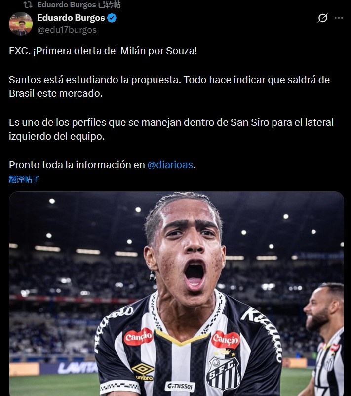 该记者写道:“独家消息:米兰为索萨开出首份报价!桑托斯正在考虑这份报价,种种迹象表明,他将在本转会窗口离开巴西。索萨是米兰高层正在为球队左后卫位置考察的目标人选之一。”