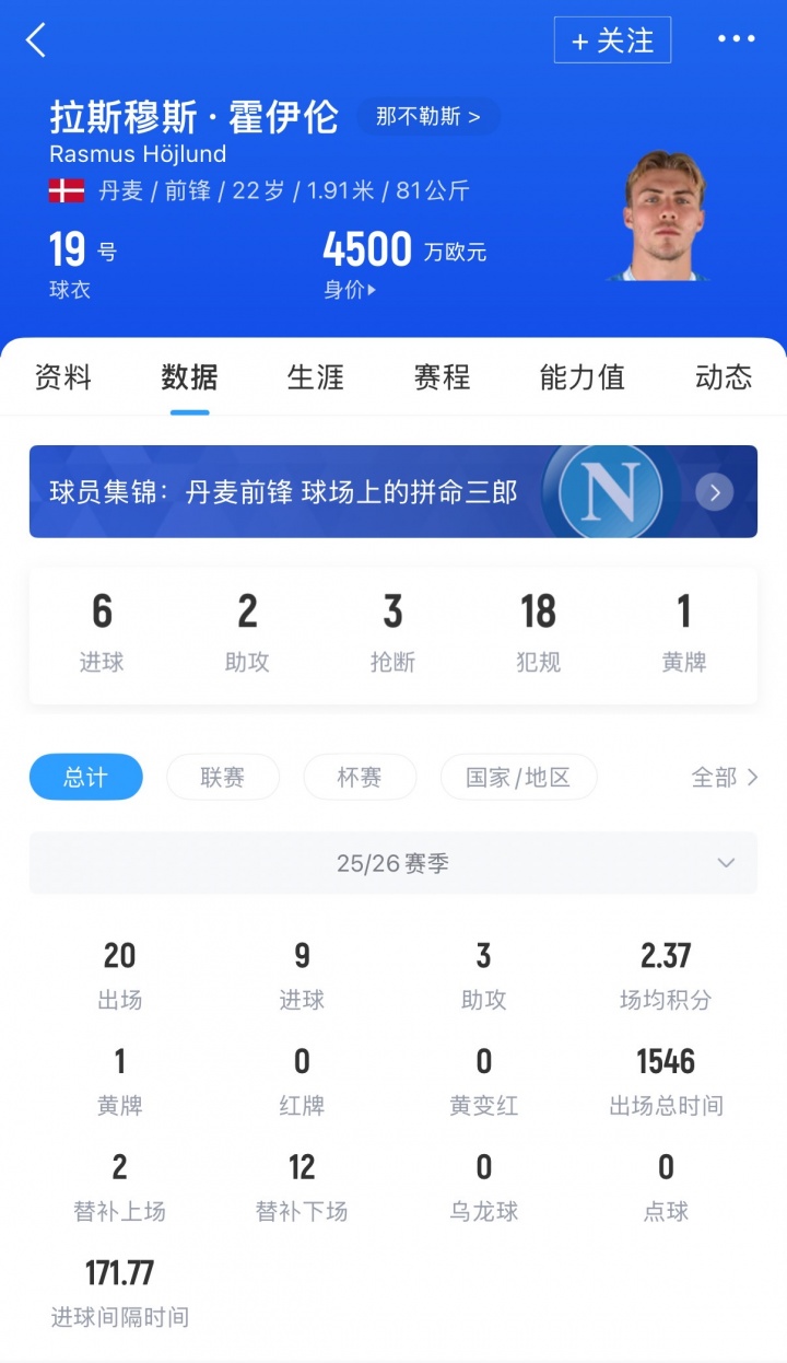 本赛季22岁的霍伊伦为那不勒斯出战20场比赛,贡献9球3助,球队目前排名意甲第3,霍伊伦德转身价已经涨至4500万欧。