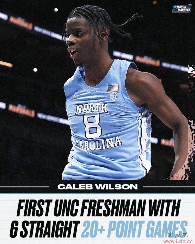 本场比赛,北卡大一新生凯勒布·威尔逊出场36分钟,15投9中,拿到22分16板6助2封盖。加上之前五场比赛得分都至少达到20分,他成为了北卡队史上,第一位连续六场比赛得分20+的大一新生。