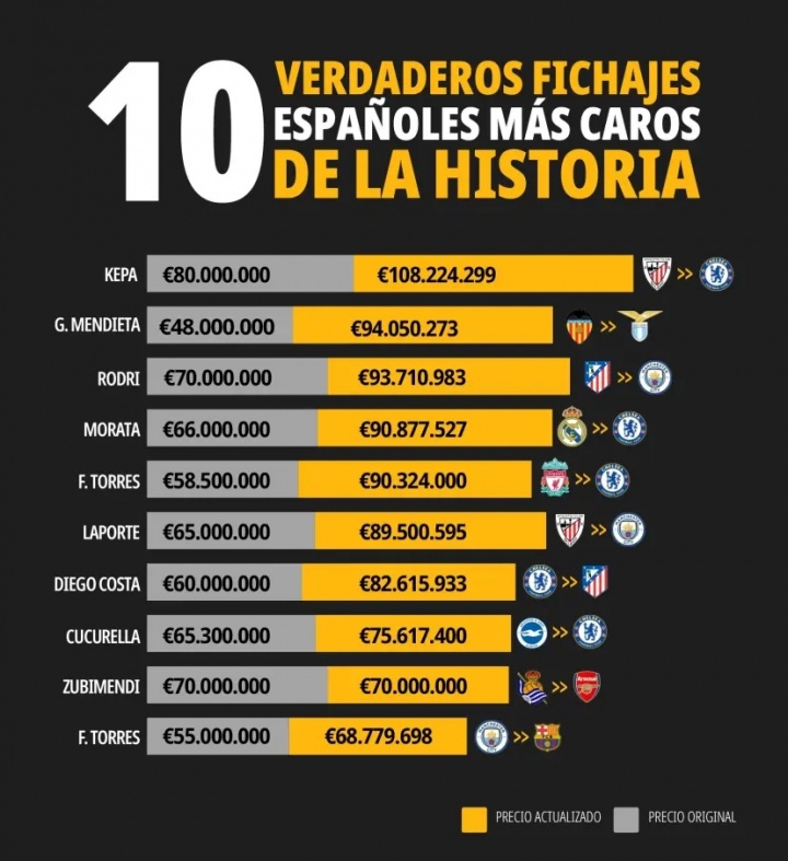 零点吧足球12月31日讯 西班牙媒体《马卡报》根据相关网站数据,计算了考虑通货膨胀后的西班牙球员转会费前10,凯帕2018年以8000万欧元的转会费从毕尔巴鄂竞技加盟切尔西,在计算通胀后,相当于现在的1.08亿欧元。