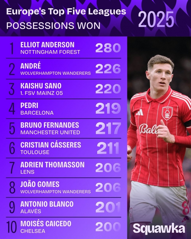 零点吧足球12月31日讯 2025年即将结束,数据机构squawka也统计了本年度五大联赛夺回球权情况,诺丁汉森林中场埃利奥特·安德森独自领跑。