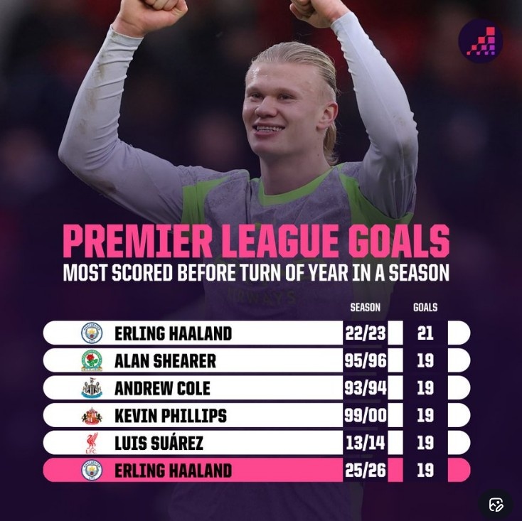 英超新年之前射手榜:本赛季哈兰德19球次席,仅次于自己的纪录