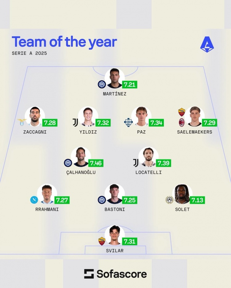 sofascore意甲2025最佳阵:恰20领衔国米3将,伊尔迪兹、萨56在列