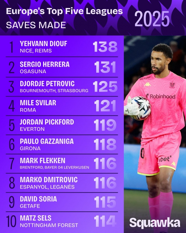 零点吧足球1月1日讯 Squawka列2025年五大联赛门将扑救次数榜,尼斯门将叶赫万·迪乌夫以138次居首。