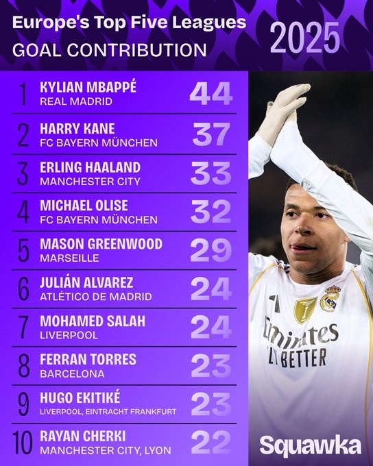 零点吧足球1月1日讯 2025年已经结束,squawka也统计了五大联赛直接参与进球榜,姆巴佩独占鳌头。