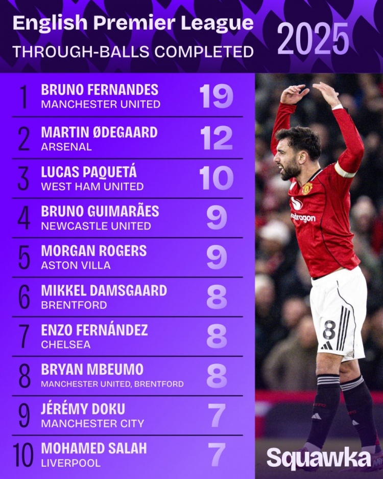 零点吧足球1月1日讯 数据网站Squawka盘点了2025年英超联赛球员直塞球次数排行,曼联中场B费19次直塞,大幅领先排名榜首,阿森纳中场厄德高12次第二。