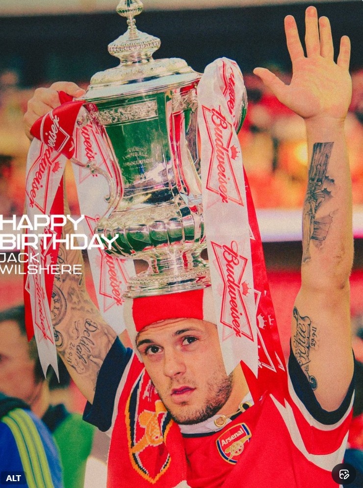 零点吧足球1月1日讯 今天是前阿森纳球员威尔希尔34岁生日,阿森纳官推也晒出球员昔日随队夺冠旧照为其送上生日祝福。