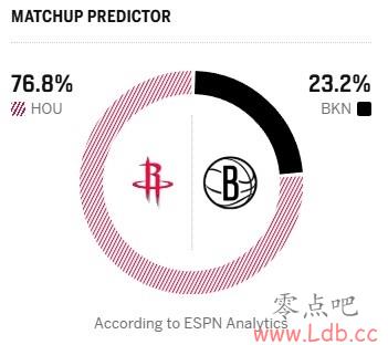 今天ESPN给出了本场比赛的胜率预测,火箭高达76.8%,篮网只有23.2%。