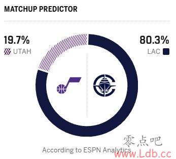 今天ESPN晒出本场胜率预测,快船为80.3%,爵士只有19.7%。