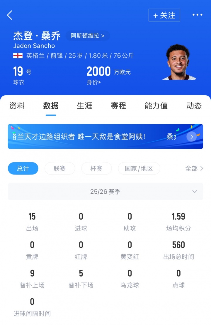 报道称,桑乔自夏窗加盟维拉以来,在英超仅仅首发过1次,至今未贡献进球或者助攻。曼联已经准备接受夏天免费放走他的事实。