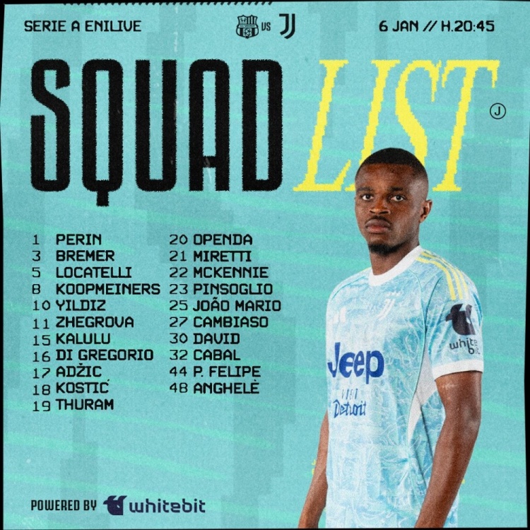 零点吧足球1月6日讯 北京时间1月7日凌晨3:45,2025-26赛季意甲联赛第19轮,尤文图斯将客战萨索洛。赛前,尤文公布了本场比赛球队大名单,弗拉霍维奇和米利克伤缺,伊尔迪兹领衔进攻线。