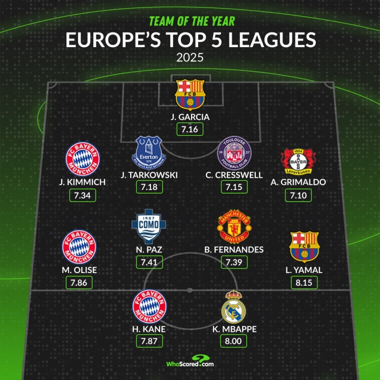 WhoScored五大联赛2025年最佳阵容(联赛场均评分)