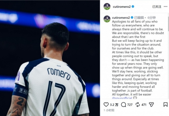 在发布文章后,罗梅罗编辑了社媒,删除了“说一些谎言”的文字部分。