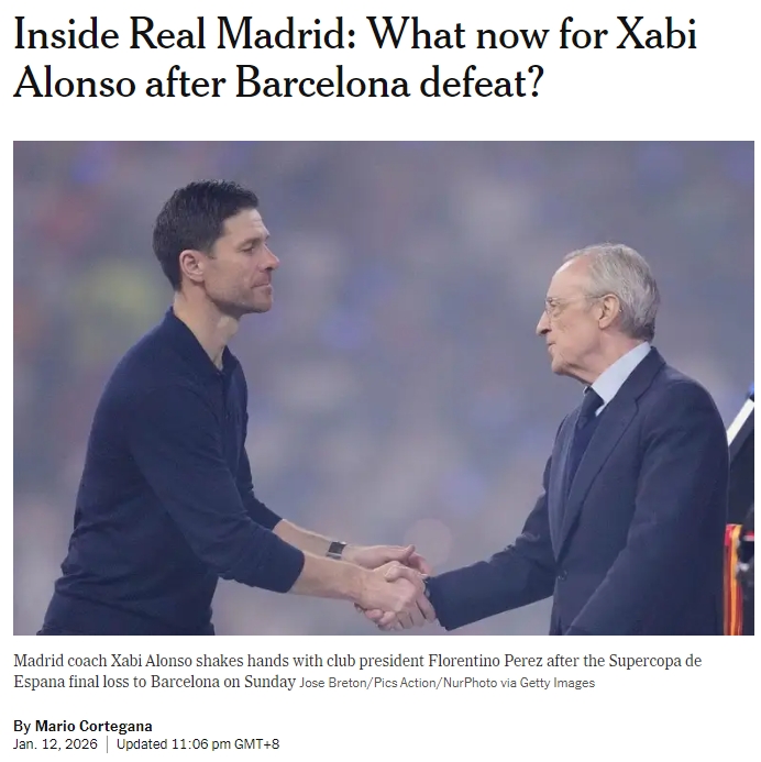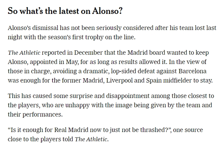 零点吧足球01月13日讯 皇马今日凌晨官宣了主帅阿隆索下课的消息,而此事两小时前,较权威的媒体The Athletic(TA)跟队Mario Cortegana还曾报道称,在西超杯决赛不敌巴萨后,皇马并未认真考虑解雇阿隆索。