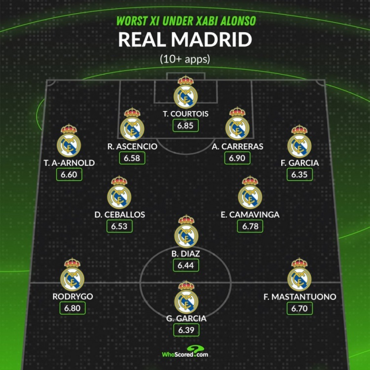 零点吧足球1月13日讯 皇马已经官宣解雇哈维·阿隆索,whoscored也统计了他任期内的皇马球员场均评分最差阵容。