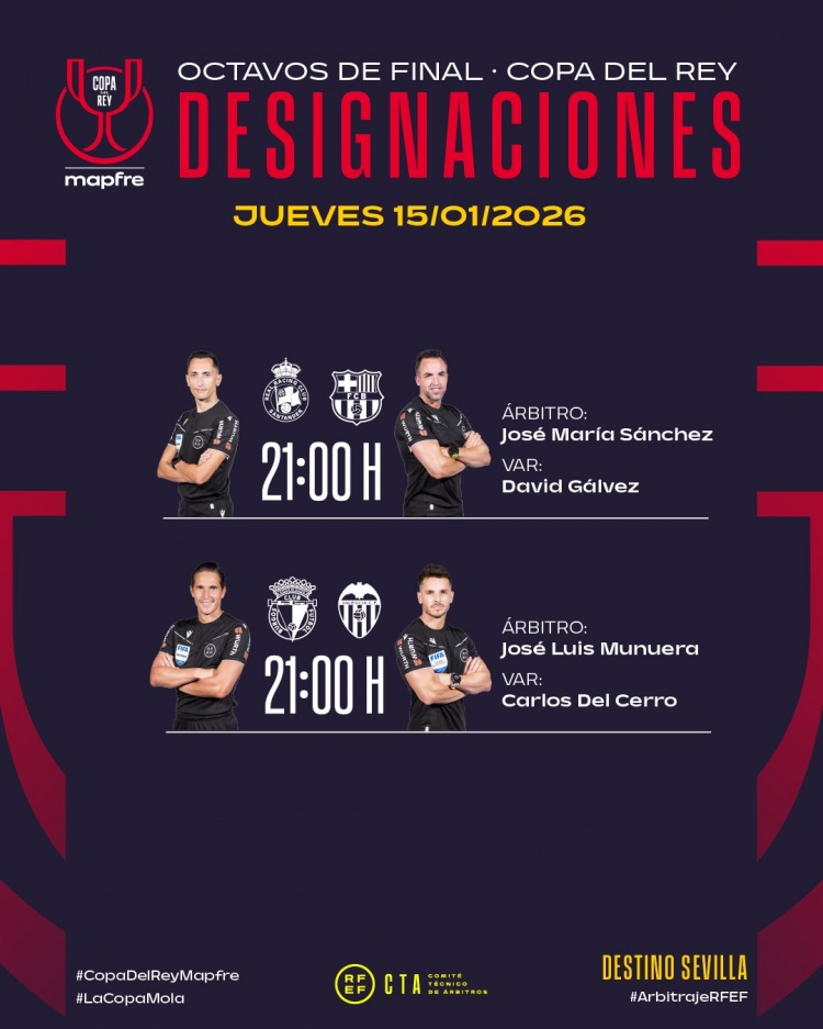 零点吧足球1月14日讯 西班牙足协官方公布了国王杯1/8决赛两场比赛的裁判安排,其中,何塞·马里亚·桑切斯执法巴萨客战桑坦德竞技。