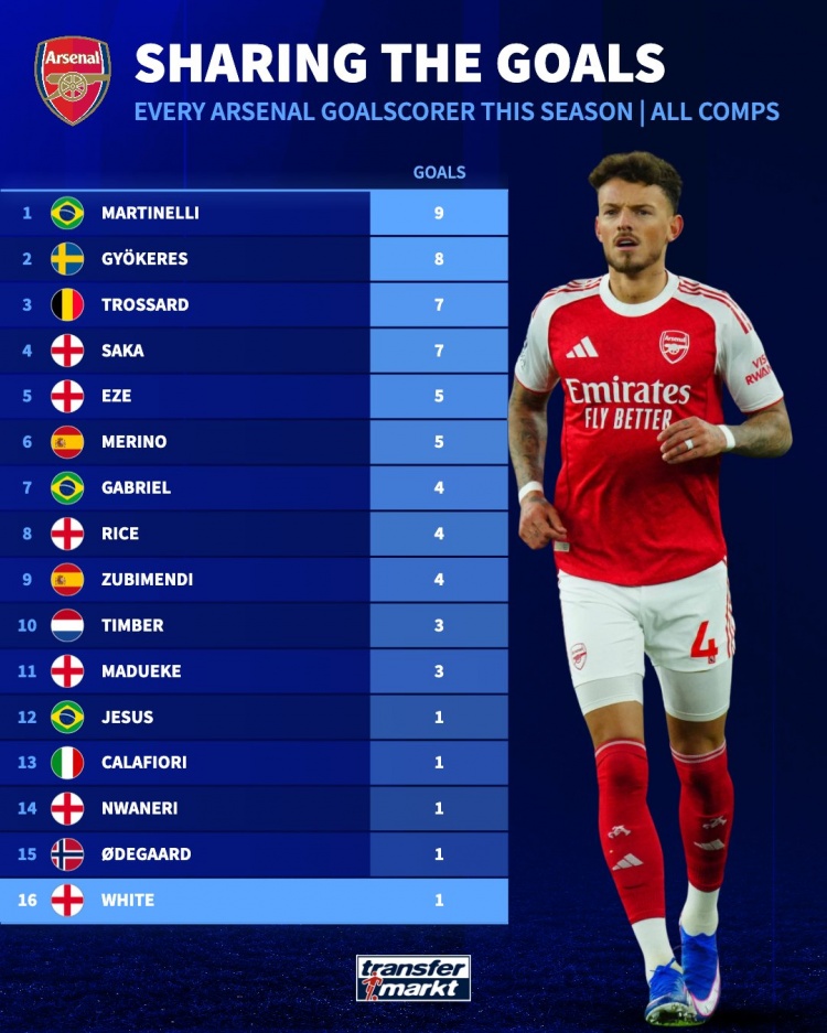 多点开花!阿森纳本赛季16人取得进球,马丁内利打进9球最多