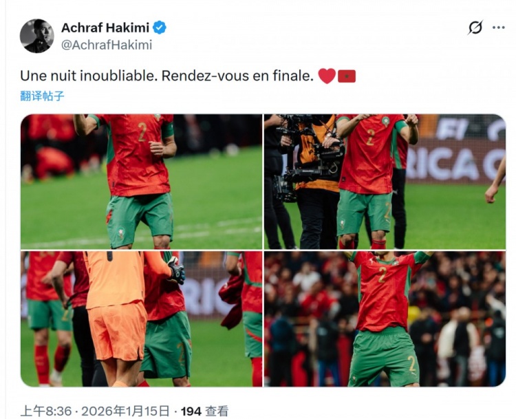 此役阿什拉夫为摩洛哥踢满120分钟,并在点球大战中命中,赛后他在社交媒体上晒照庆祝晋级,配文:“难忘的一夜,决赛见!”