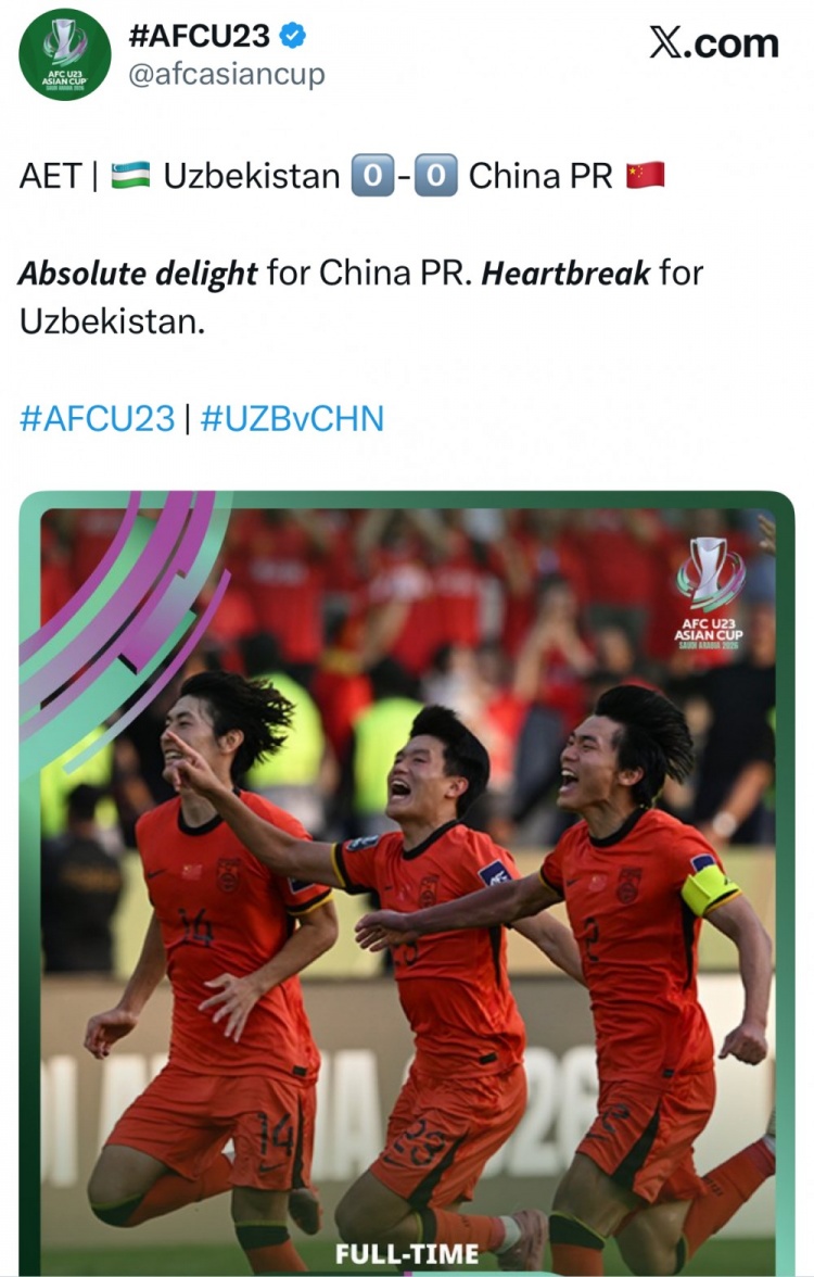 赛后U23亚洲杯官推发文报道了本场比赛,文案写道:“兴高采烈的中国队,心如刀绞的乌兹别克斯坦队。”
