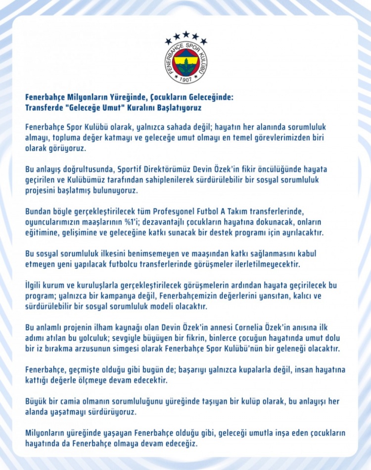 费内巴切一线队球员们承诺将捐出他们薪水的1%,作为一项旨在支持贫困儿童及其教育、发展和未来机会的新倡议的一部分。这项倡议由足球总监德文·厄泽克提出,并得到了费内巴切全队的支持。