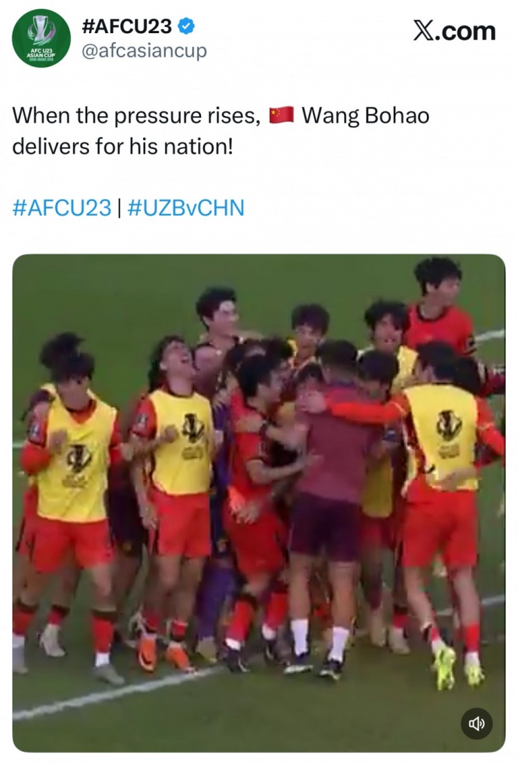 亚足联官推晒出这个进球以及进球后国足庆祝的视频,并配文写道:“压力骤起,但王博豪的射门帮助他的国家队成功晋级!”