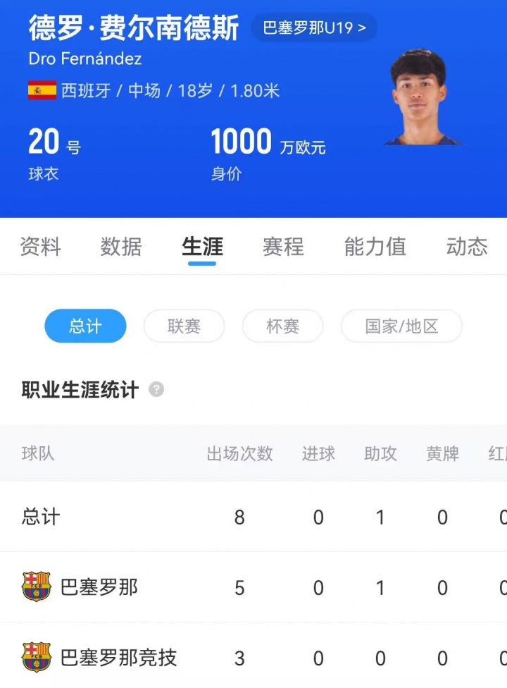德罗·费尔南德斯现年18岁,2022年加入巴萨青训,目前德转身价1000万欧。本赛季他被提拔至巴萨一线队并出场5次,欧冠比赛贡献1次助攻。