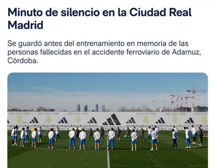 全体球员以及教练组成员在训练场上肃立,为近期发生在西班牙科尔多瓦省阿达穆斯地区的严重列车事故中的遇难者默哀一分钟,以此表达俱乐部对逝者的深切哀悼以及对受害者家属的慰问。