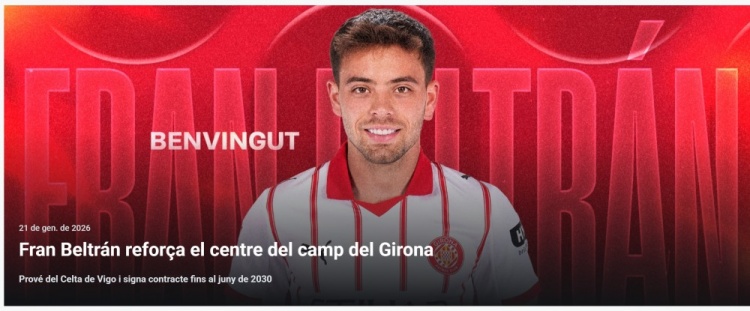 官方:赫罗纳签下塞尔塔中场贝尔特兰,合同至2030年6月
