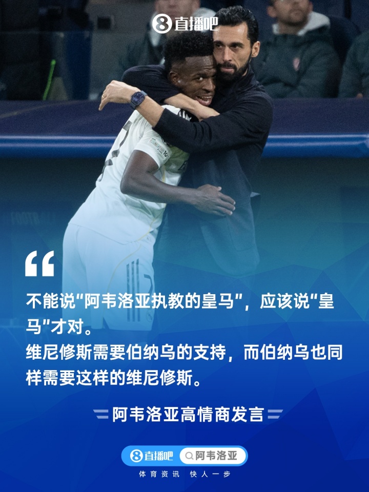 阿韦洛亚:其实我没有特别留意那一个瞬间,但今天我看到的是一个与球队并肩前行的伯纳乌,不仅是对维尼修斯,对姆巴佩、对贝林厄姆,对每一位球员都是如此。球员们在场上拼尽了全力,他们不仅踢出了精彩的配合、打进了精彩的进球,更付出了超乎寻常的跑动与防守。
