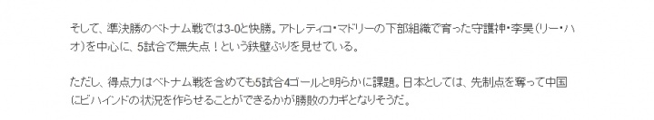 不过,其进攻得分能力依然是显而易见的短板,即便计入对阵越南的比赛,5场比赛也仅有4个进球。对于日本队而言,能否率先取得进球,使中国队陷入比分落后的境地,似乎将成为左右胜负的关键。