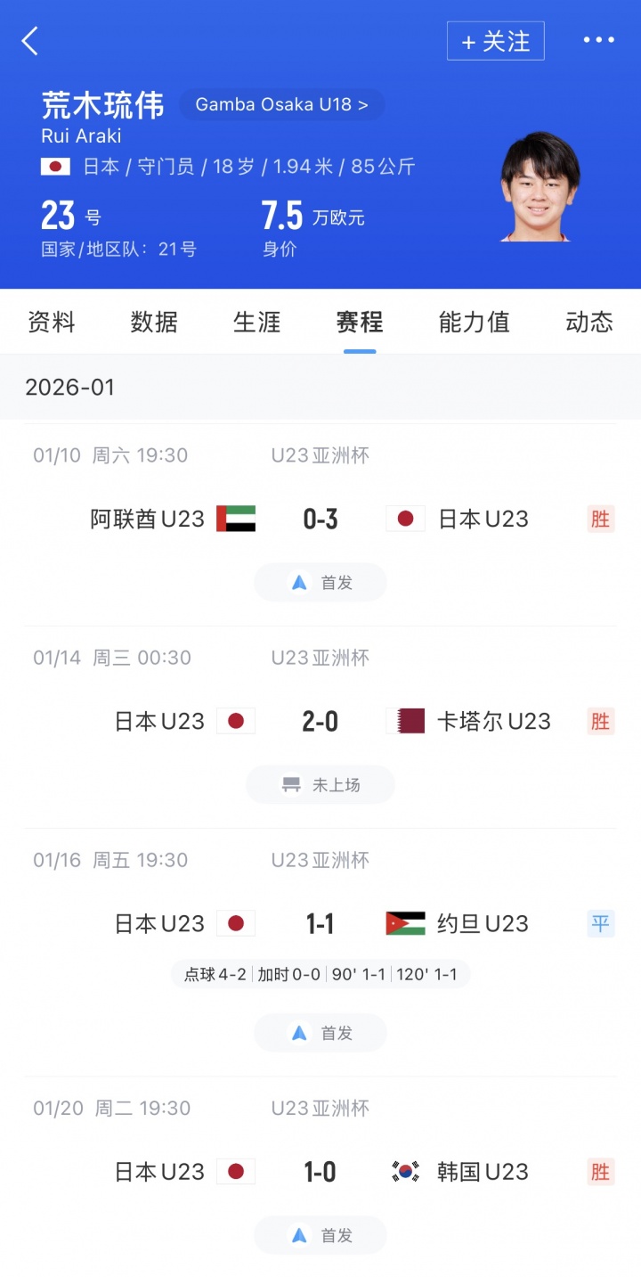 三年前U17亚洲杯日本夺冠时,荒木琉伟是替补,荒木琉伟谈及自己成长说道:“关键在于赛前准备,对每个动作都要做好充分准备。无论是扑救射门还是应对高空球,任何环节都离不开充分准备。当我意识到这一点后,开始通过站位和预判做好准备,从而提高。”