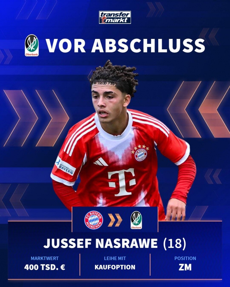 零点吧足球1月23日讯 Sport.de援引德转消息,拜仁二队的18岁中场小将尤瑟夫·纳斯拉维即将外租加盟奥地利甲级联赛球队列特。