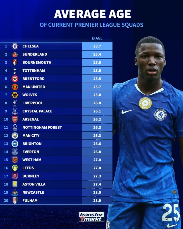 德转列英超各队平均年龄:切尔西23.7岁最小,富勒姆28.9岁最大