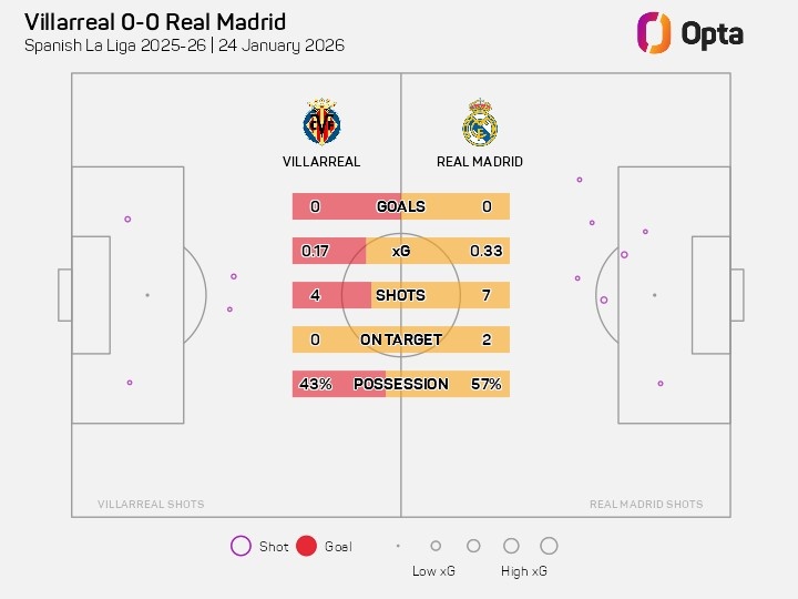据Opta统计,此役上半场比利亚雷亚尔射门4次、射正0次,据Opta统计,皇马是2026年五大联赛唯一上半场还没有被对手射正过的球队。