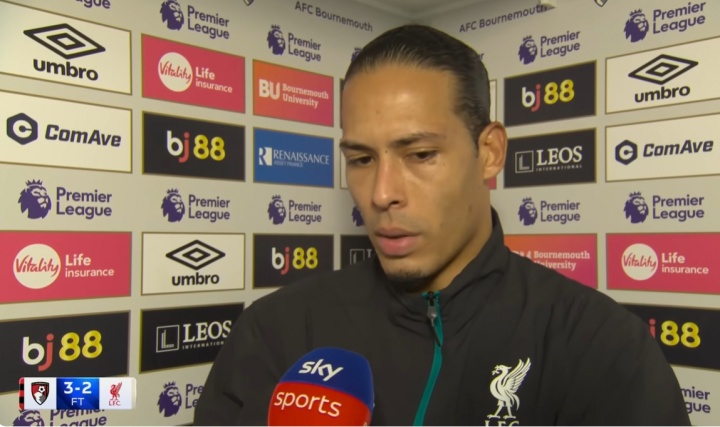 零点吧足球01月25日讯 利物浦2-3遭伯恩茅斯绝杀,队长范戴克本场比赛失误送礼+破门,赛后他和主帅斯洛特都将第一个丢球时的失误归咎于风的因素。