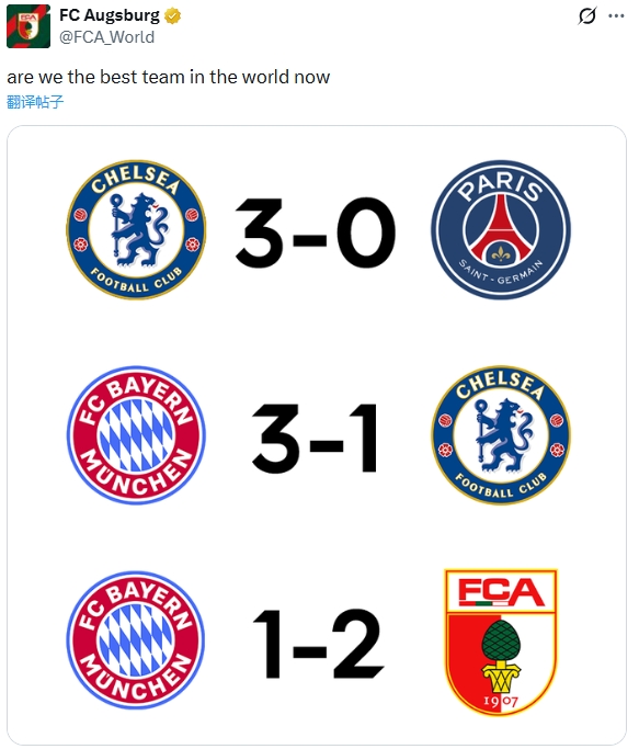 皮一下!奥格斯堡晒图>拜仁>切尔西>巴黎:我们现在是最佳了吗