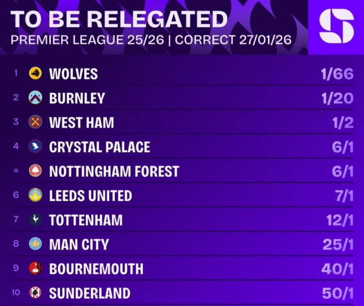 本赛季英超降级赔率排名: