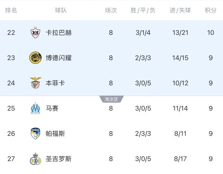 据统计,本轮赛前马赛有96%的概率能够晋级附加赛,但是球队0-3惨败,加上本菲卡门将特鲁宾补时进球,最终球队以1个净胜球的劣势排名第25遭到淘汰。