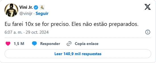 维尼修斯与“争议”一词总是携手同行。所有人都记得,维尼修斯上赛季在金球奖上输给了罗德里。颁奖典礼后,维尼修斯在社交媒体‘X’上发布了一条推文,迅速走红。维尼修斯写道:“如果需要,我会做到10次。他们还没准备好。”