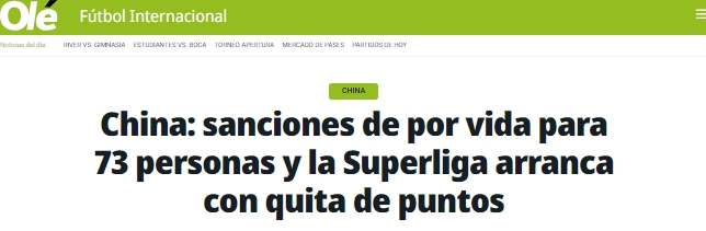 阿根廷媒体关注中国足坛假赌黑处罚:亚洲足球大国遭到了严厉制裁