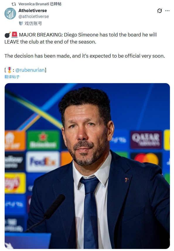 阿根廷国家队跟队记者Veronica Brunati转发了一则小道消息,马竞主帅西蒙尼告知管理层,他将在赛季末离任,决定已经作出,预计很快官宣。
