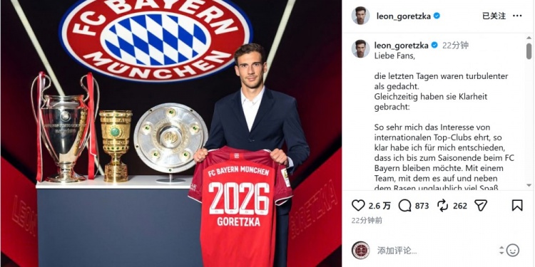 格雷茨卡社媒:我已决定留在拜仁到本赛季结束,然后开启新篇章