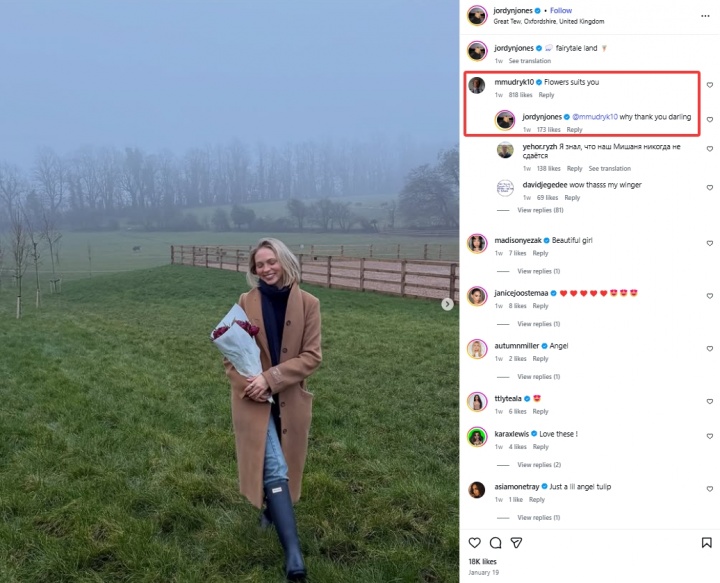 在乔丁·琼斯晒自己手捧鲜花的社媒下,穆德里克评论:花很适合你