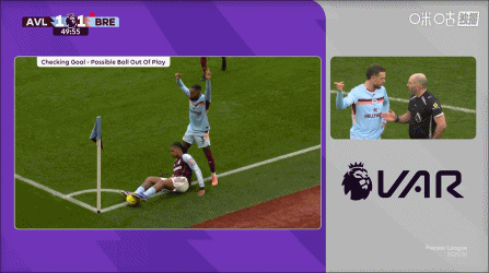 经过VAR回放,裁判推翻了此前阿斯顿维拉进球的判罚,认定球在进攻控球阶段已经出界。