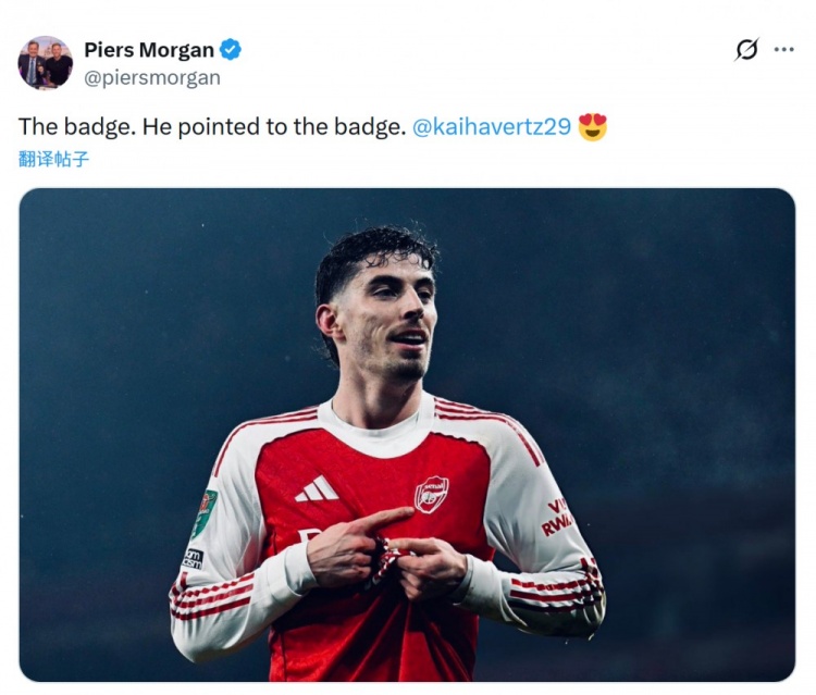 哈弗茨进球后手指队徽庆祝,阿森纳球迷摩根社媒晒出哈弗茨庆祝进球的照片,配文:“队徽,他指着队徽。”