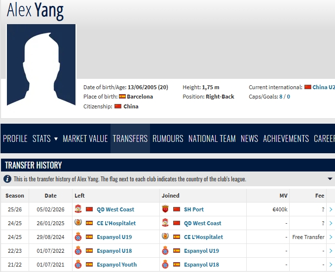 零点吧足球02月05日讯 据德转显示,20岁的右后卫杨希已经从青岛西海岸转会至上海海港。