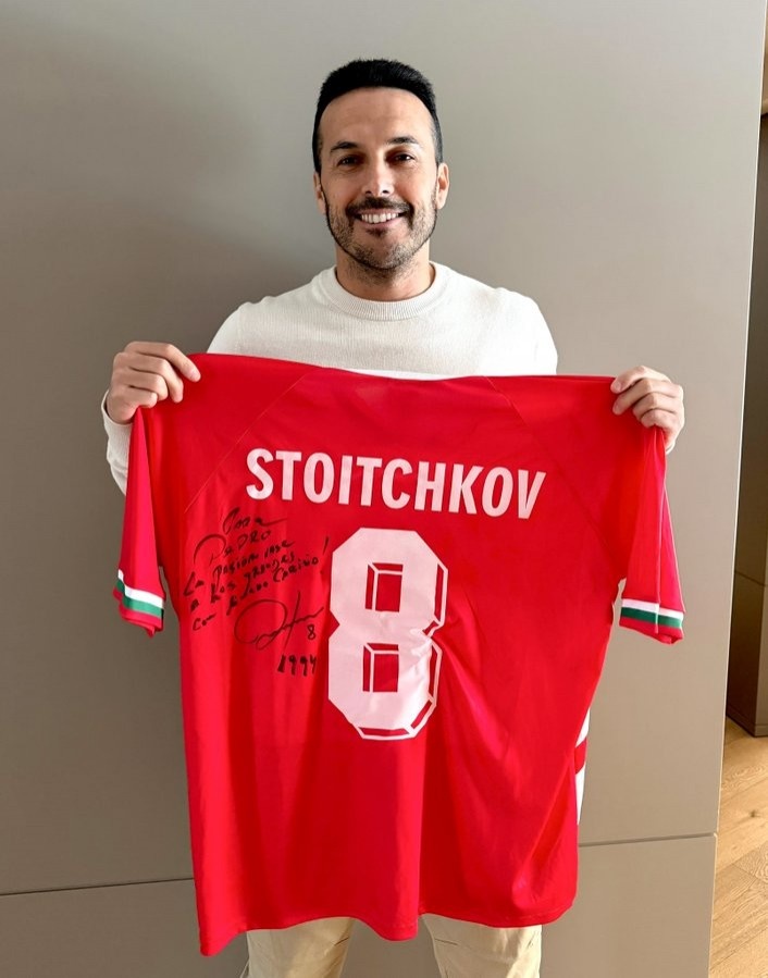 佩德罗写道:“感谢我伟大的朋友、儿时偶像赫里斯托·斯托伊奇科夫赠送的这份珍贵礼物:他亲笔签名的1994年世界杯保加利亚球衣。我会将它珍藏于心,传奇永驻!!????”
